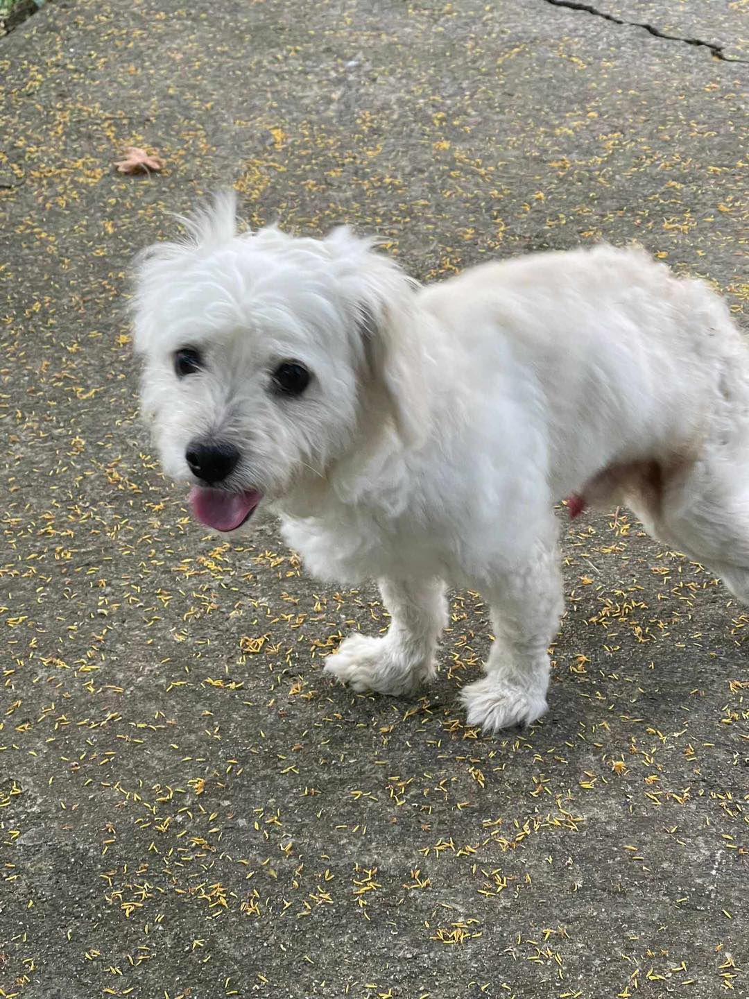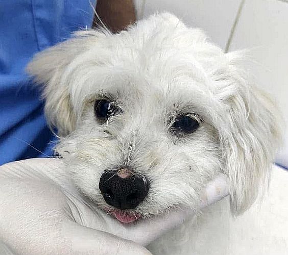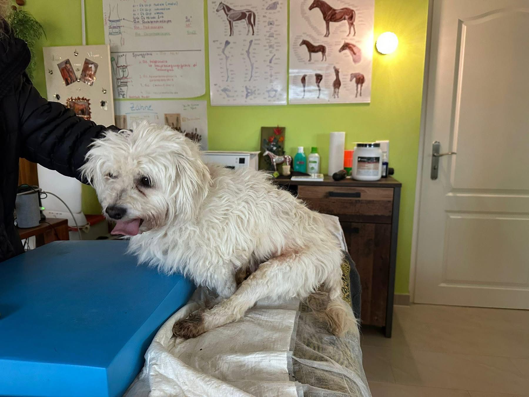 Calimero ist etwa 6–7 Jahre alt, geimpft, gechipt, kastriert ein kleiner Bichon-Frisé mit gerade einmal 6 kg. Seine Hinterbeinchen sind leider gelähmt, dennoch will er und zeigt dies auch immer bei seiner Physiotherapie .